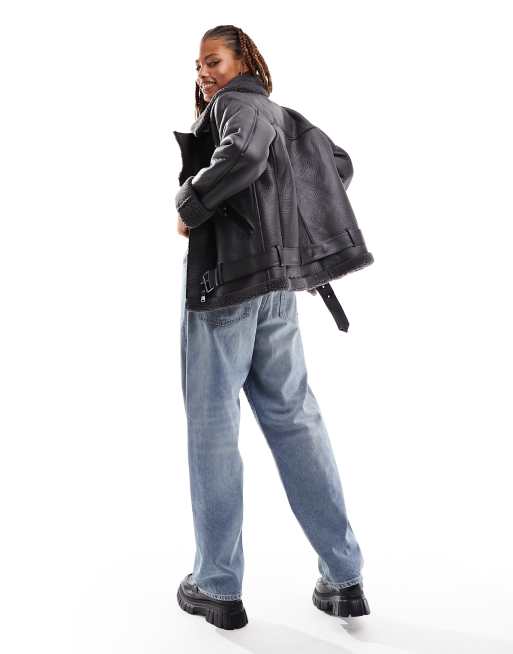 Only faux leather aviator jacket in charcoal Very well made.